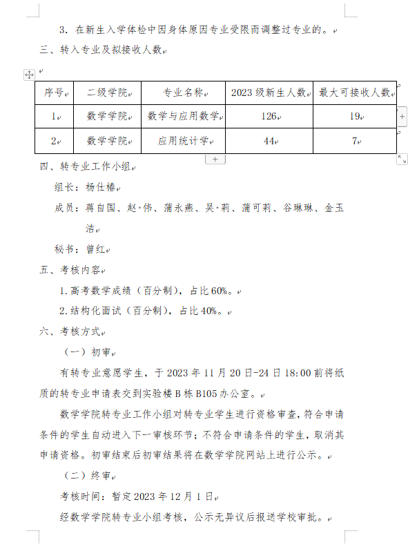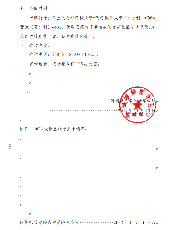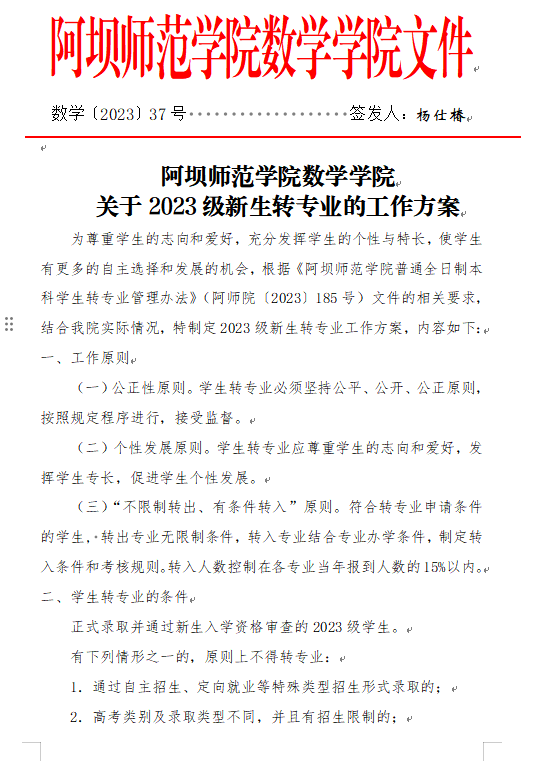 阿坝师范学院数学学院关于2023级新生转专业的工作方案