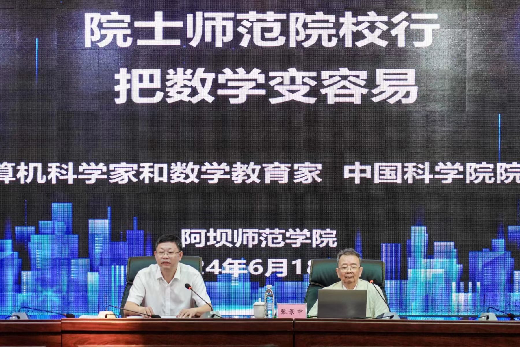 【本网讯】6月18日,由教育部和中国科学院、中国工程院、中国科协联合举办的“院士师范院校行”活动走进阿坝师范学院。计算机科学家、数学教育家、中国科学院院士张景中作题为《把数学变容易》讲座。讲座在阿坝师范学院学术报告厅举行,由阿坝师范学院党委副书记、校长向武主持,阿坝师范学院200余名师生代表线下聆听讲座。