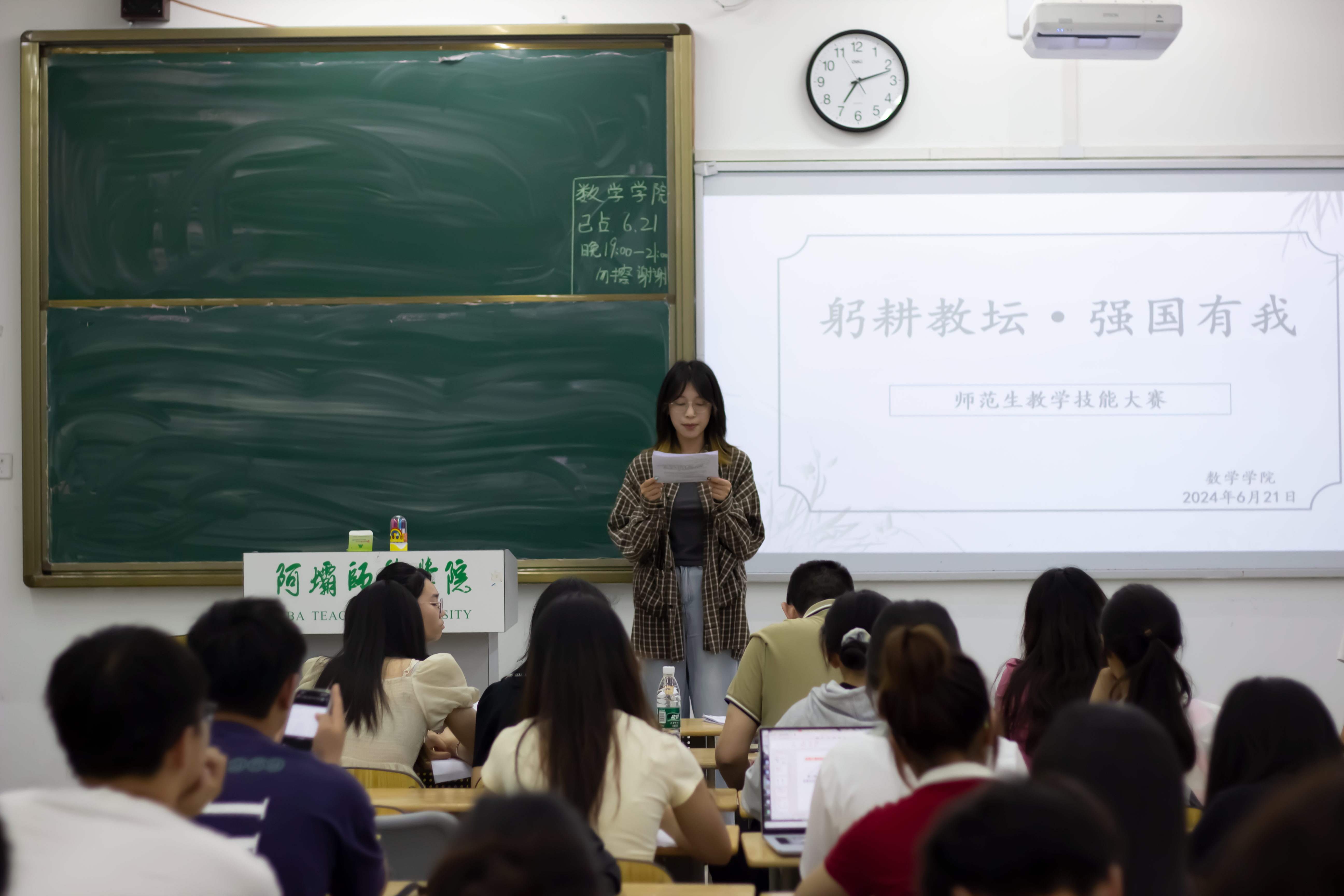 【本网讯】2024年6月21日19:00,数学学院于树人楼D102举行第四届师范生教学技能大赛。此次比赛的评委由数学学院教师董彪老师、张洁老师、杨燕华老师、马喻老师担任。参加比赛的是我院部分学生。比赛由李青颖和黄杨主持。