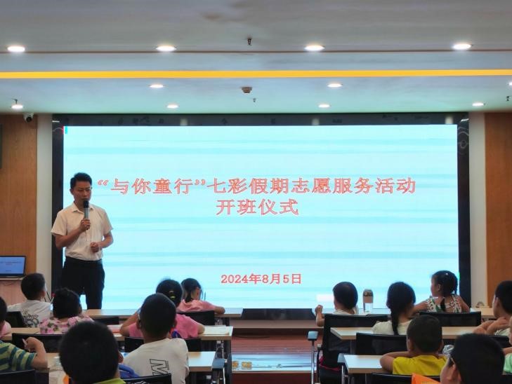 【本网讯】七彩暑期勤实践,斑斓时光正少年。2024年8月5日上午,阿坝师范学院“与你童行”志愿服务队“七彩假期”活动开班仪式在乐山市市中区通江街道茶坊社区举行。茶坊社区党委书记徐旭、茶坊社区居委会委员陈菊琴、育才教育茶坊社区托管班负责人卫桂荣,带队老师金玉洁和志愿服务队的全体成员, 以及35名社区小朋友们参加仪式。仪式由志愿服务队成员郑富桔主持。