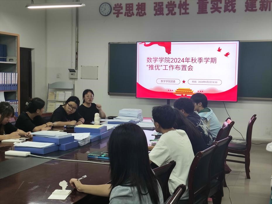 【本网讯】为了数学学院秋季学期“推优”工作的顺利开展,2024年9月2日18:00,数学学院于实验楼B113召开了数学学院2024年秋季学期“推优”工作布置会,参加此次会议的有数学学院各班团支书。此次会议由数学学院团委书记金玉洁老师主持。