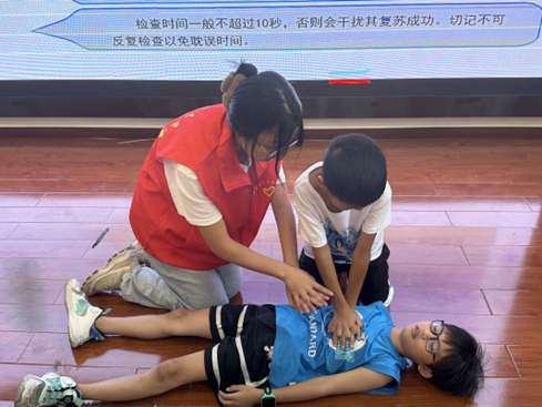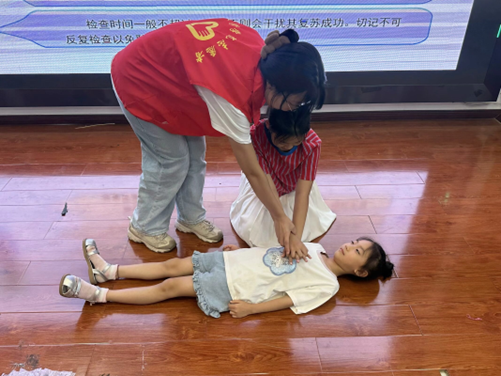 水域无情,生命有价。志愿者张诗彤为同学们带来了防溺水安全教育课程。志愿者首先通过课件展示了近年来因溺水导致的悲剧案例,使同学们深刻认识到溺水的危害性。接着详细讲解了溺水的成因、预防措施及急救方法。在讲解过程中,志愿者特别强调了学生们在假期期间的安全防范意识,提醒同学们要遵守安全规则,切勿私自到河流、湖泊等危险水域游泳。同时,还向同学们介绍了游泳技巧和自救方法,以及在发现他人溺水时如何进行施救的步骤和方法。在现场着重展示胸外按压方法,志愿者示范之后,小朋友们积极举手到讲台上参与方法学习。勇于实践,才能在关键时刻临阵不乱,保持冷静。