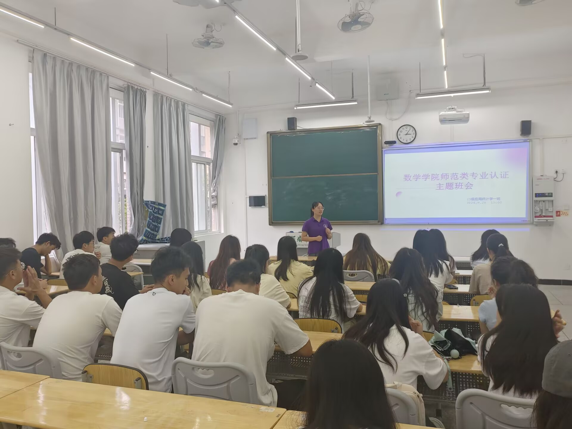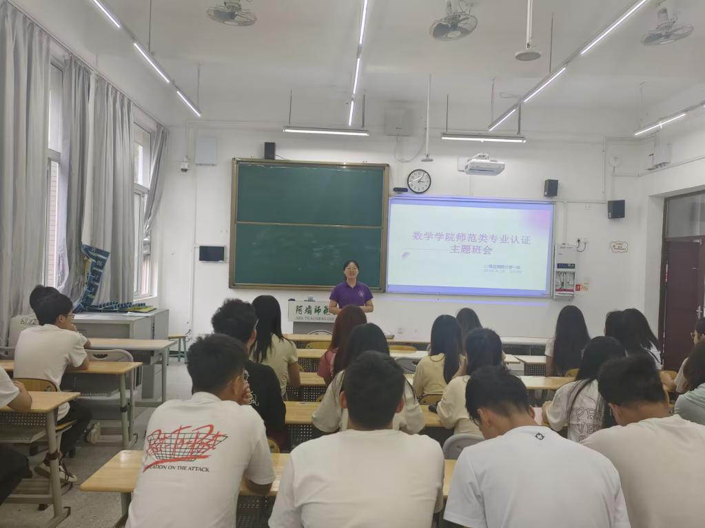 【本网讯】为了让同学们更加了解师范认证的基础知识,做好迎接师范认证工作的准备。2024年9月28日15:00,数学学院2023级应用统计学1班于树人楼D204开展了师范认证基础知识学习主题班会。参加本次会议的有2023级应统1班全体同学,此次班会由团委书记金玉洁老师主持。
