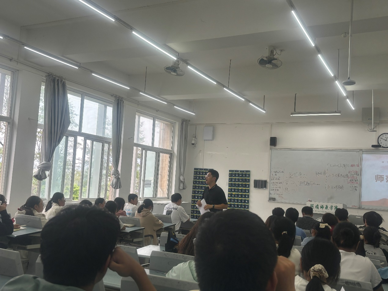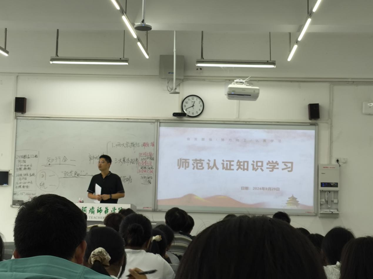 【本网讯】2024年9月29日12:40,数学学院2024级数学与应用数学二班于树人楼C203开展了师范类专业认证基础知识学习主题班会,参加此次班会的是2024级数应二班全体同学,此次班会由辅导员王全智老师主持。