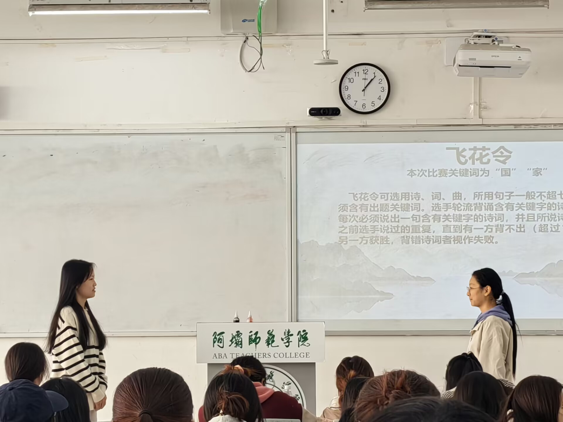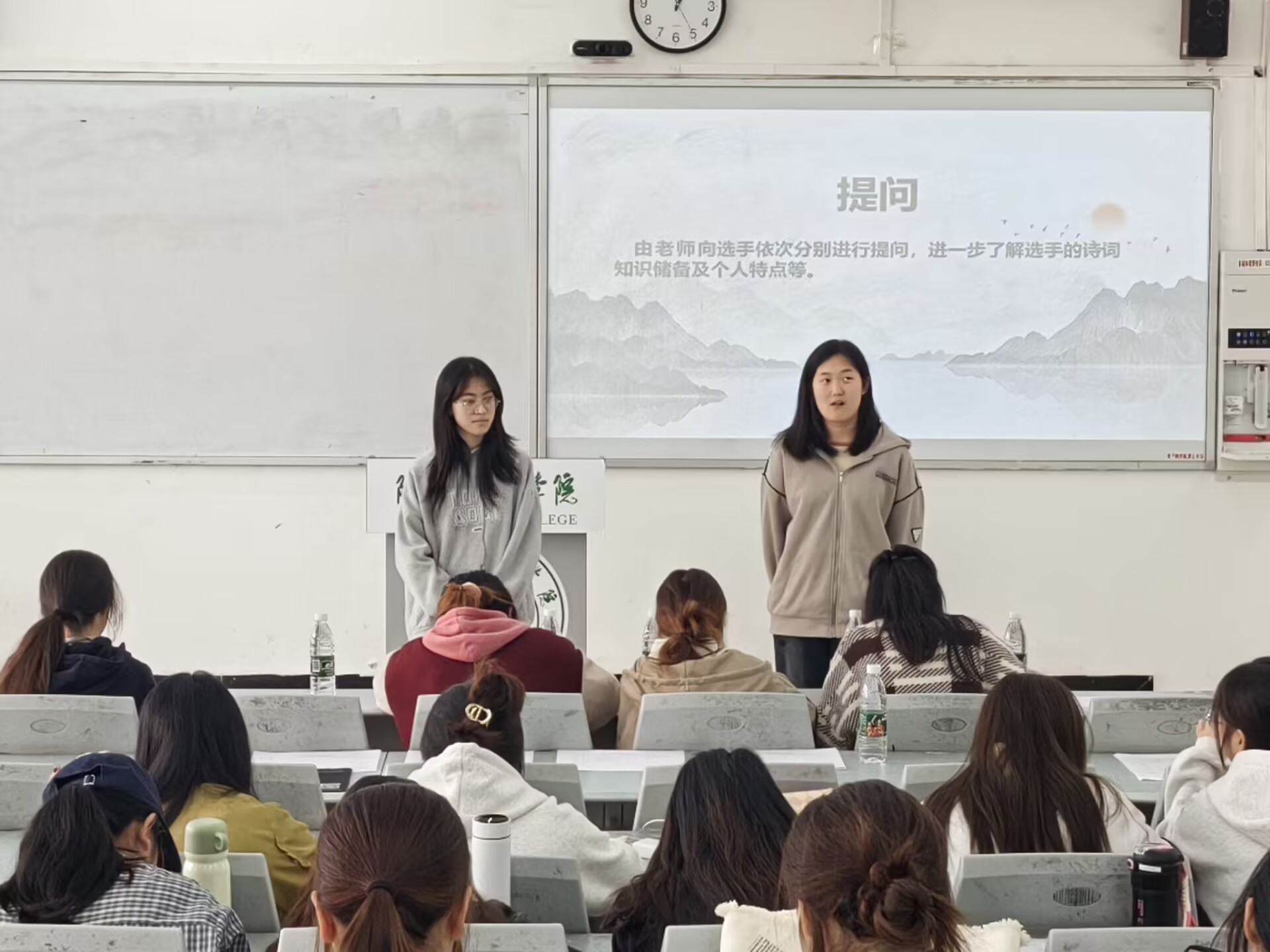 此次比赛以“国”“家”为主题,参赛选手按照事先抽签顺序按小组依次进行比赛。比赛设置诗词朗诵、飞花令、评委提问等三个环节,不仅全面考察参赛选手的诗词基础,还考察了他们的台风及临场反应能力。比赛现场气氛热烈,选手们登台展示自己在诗词方面的储备能力以及自己对“国”和“家”的独特见解。经过选手激烈的角逐,评委现场打分,最终评选出两名一等奖、四名二等奖和四名三等奖。
