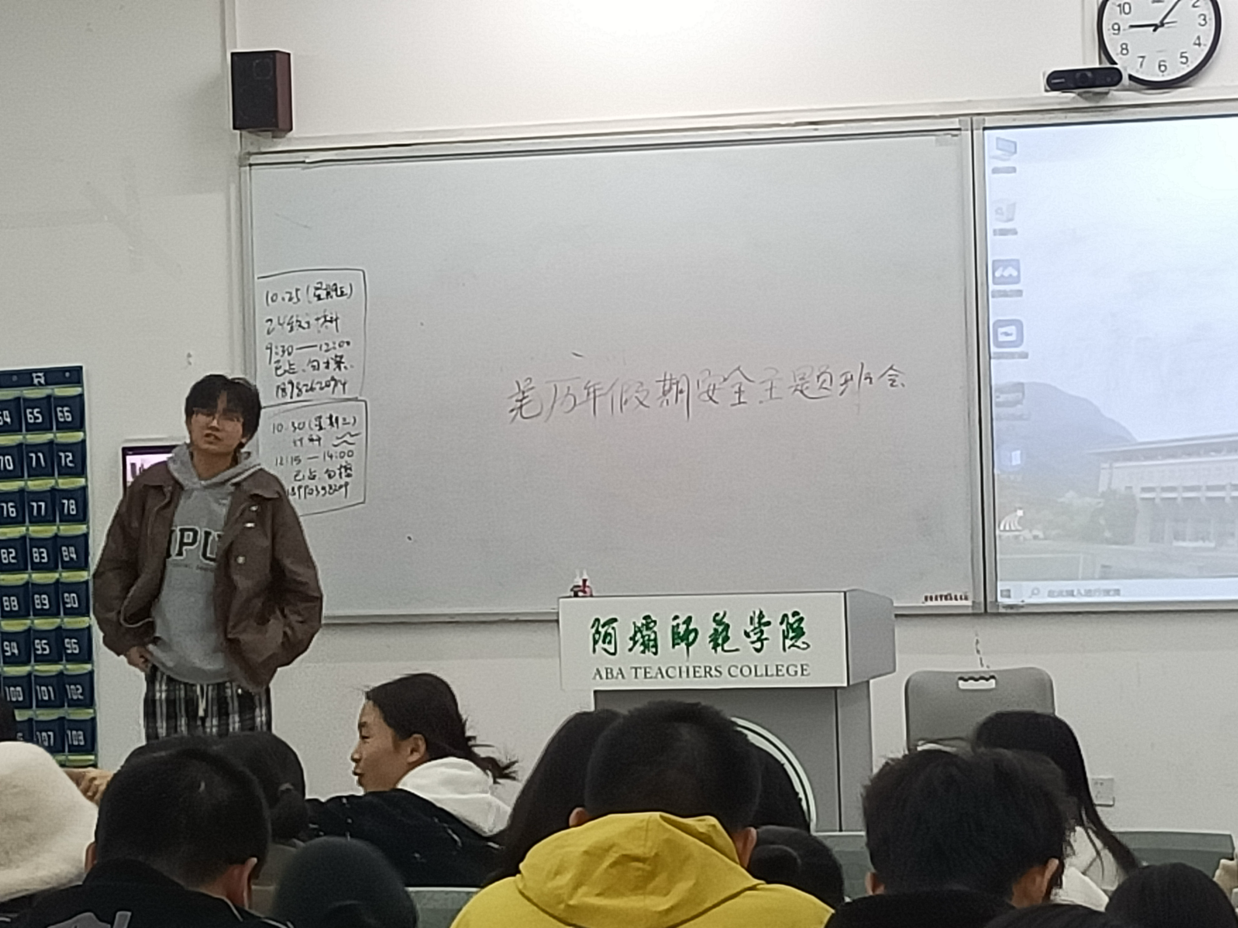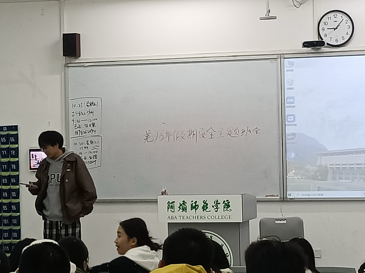 班长向同学们讲解羌历年假期安全教育知识,包括交通安全、消防安全、食品安全、网络安全、防溺水、防诈骗等方面。并提醒同学们合理安排假期时间,既要充分休息放松,也要适当安排学习,确保度过一个愉快而充实的假期。至此,会议圆满结束。