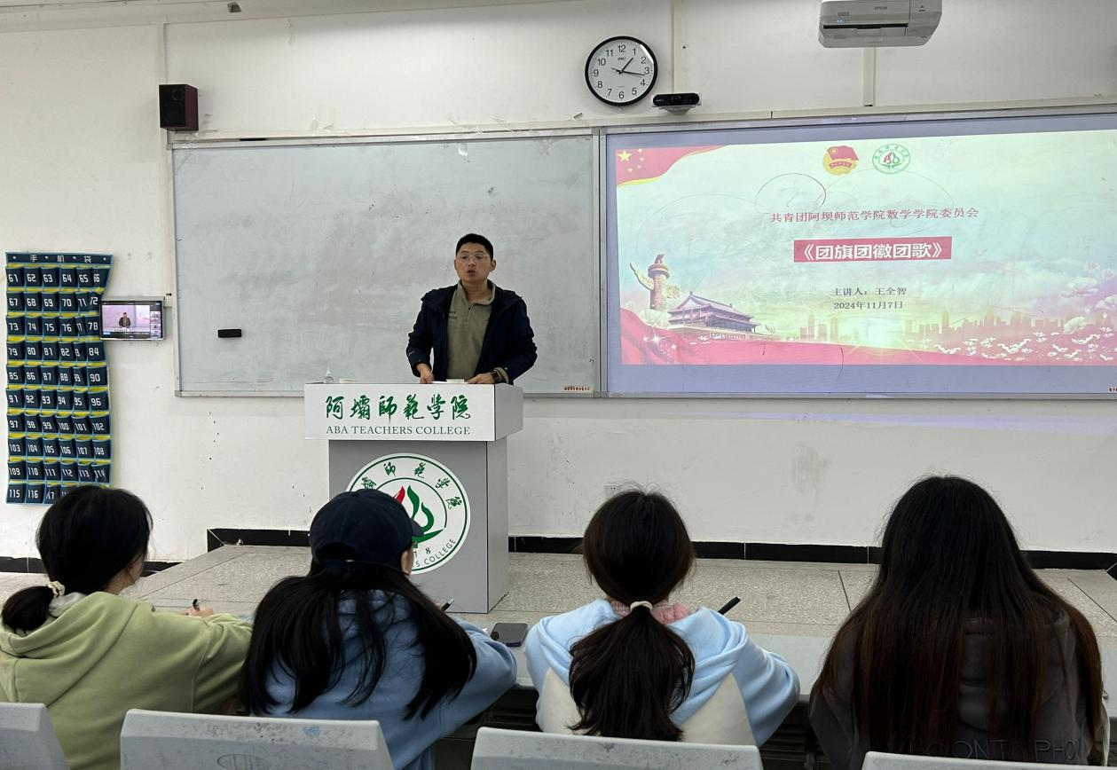 【本网讯】2024年11月8日12:40,数学学院于树人楼C101开展2024年发展新团员主题团课培训第五讲——团旗团徽团歌。本次团课的主讲人是我院团委副书记王全智老师,参加本次团课培训的是我院2024年新入团的团员以及组织部的工作人员。