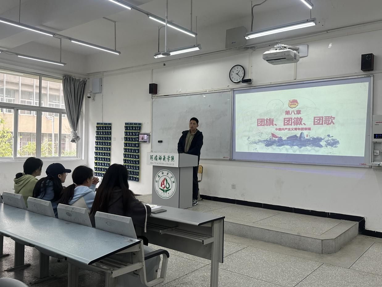 王老师介绍道,中国共产主义青年团团旗为红色,左上角缀黄色五角星,象征着革命胜利与青年团结。团徽由团旗、齿轮、麦穗、初升太阳及“中国共青团” 绶带组成,其象征意义尤为丰富和深刻。团歌《光荣啊,中国共青团》激励着团员们继承革命传统,开创美好未来。这些标志体现了共青团的光辉历史与使命,其中团徽更是以它独特的构图和寓意,成为共青团最为重要的象征之一,它不仅展现了共青团的性质和任务,也激励着一代又一代的青年为祖国的繁荣富强贡献自己的青春力量。