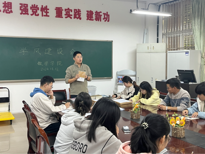 【本网讯】为深入落实立德树人根本任务,以学风带班风,以班风促院风,营造奋发向上、积极进取的良好学习氛围,2024年11月12日13:00,数学学院于实验楼B113召开学风建设会议。参加此次会议的是我院各班学习委员和纪检委员。会议由我院团委副书记王全智老师主持。