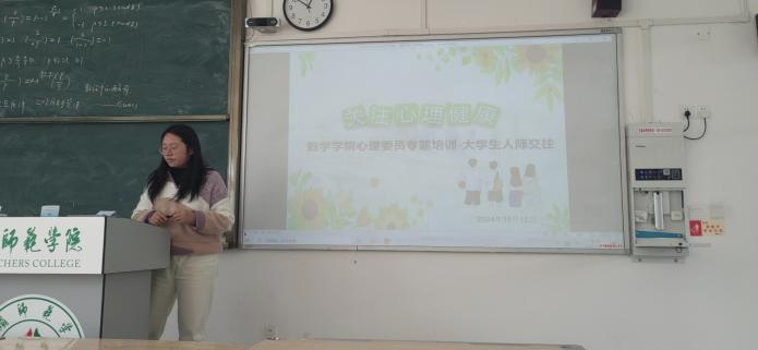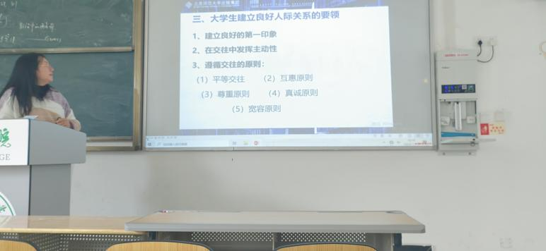 曾老师围绕如何处理人际冲突、大学生人际交往中的困惑、人际交往中的心理效应、大学生建立人际关系的要领以及如何处理宿舍关系等内容开展培训。并强调各班心理委员要多关心同学们的心理健康,比如班上同学生活方面是否存在困难,同学之间是否出现矛盾冲突,要切实履行好心理委员的工作职责。至此,会议圆满结束。