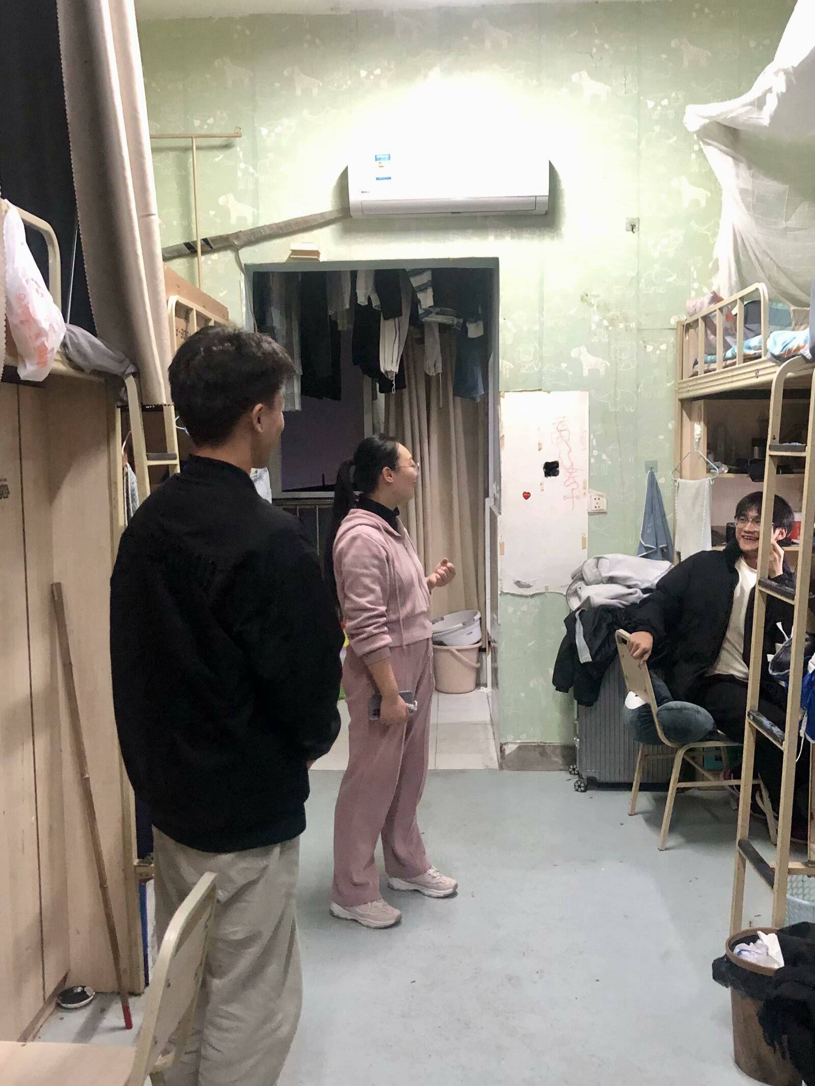 【本网讯】为加强学生宿舍管理,增强师生关系。2024年11月12日21:10,数学学院学工办副主任金玉洁老师、辅导员曾红老师以及我院公寓部成员前往我院学生宿舍开展走访寝室工作。