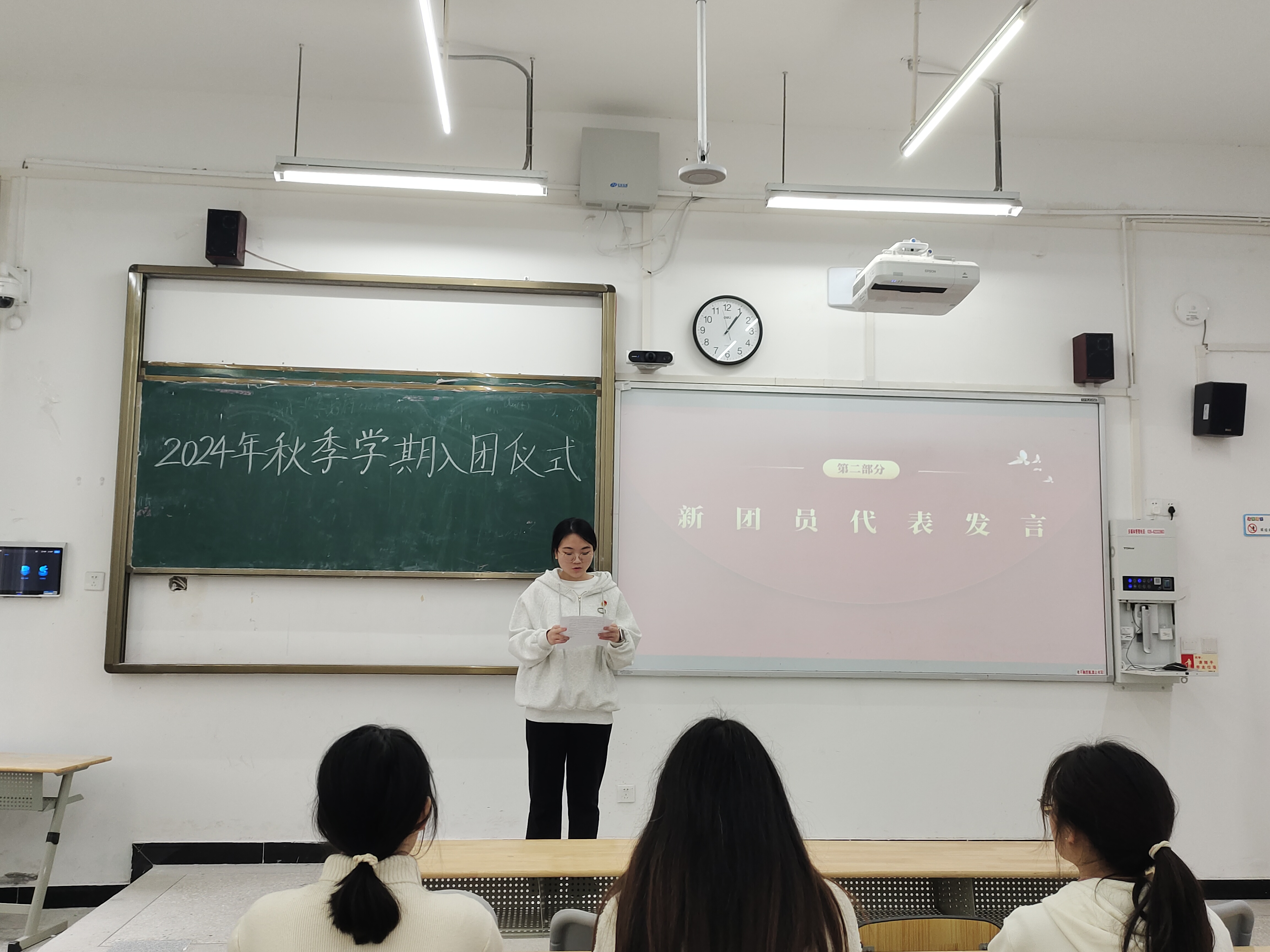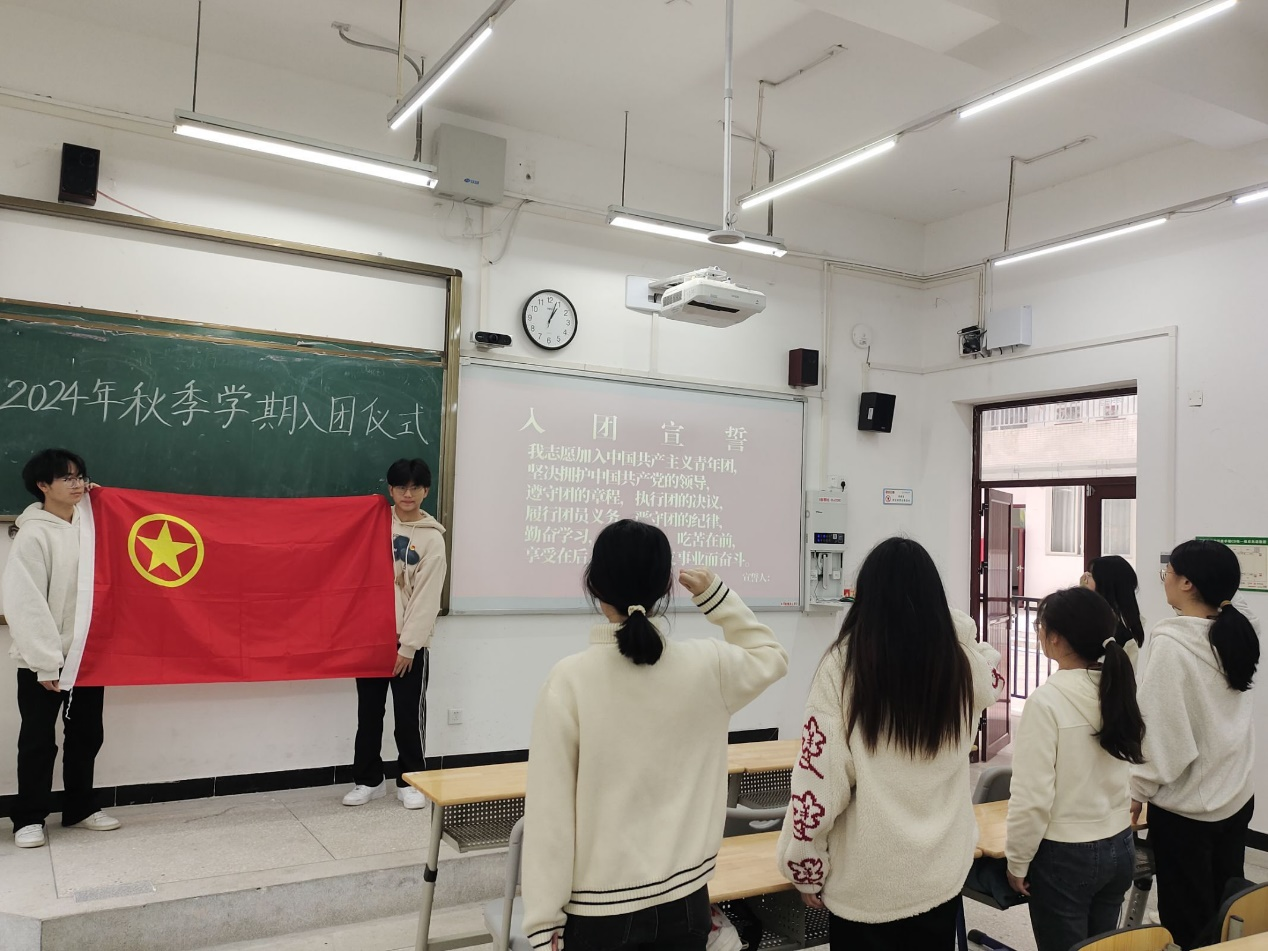 仪式开始时,金玉洁老师首先致辞,她向新团员表示祝贺,并寄予厚望。在新团员们进行了庄严的宣誓之后,工作人员为他们颁发了团徽和团员证。随后,新团员代表和老团员代表依次上台发言。最后,在全体新老团员齐声高唱《光荣啊,中国共青团》的团歌声中,此次入团仪式圆满落幕。