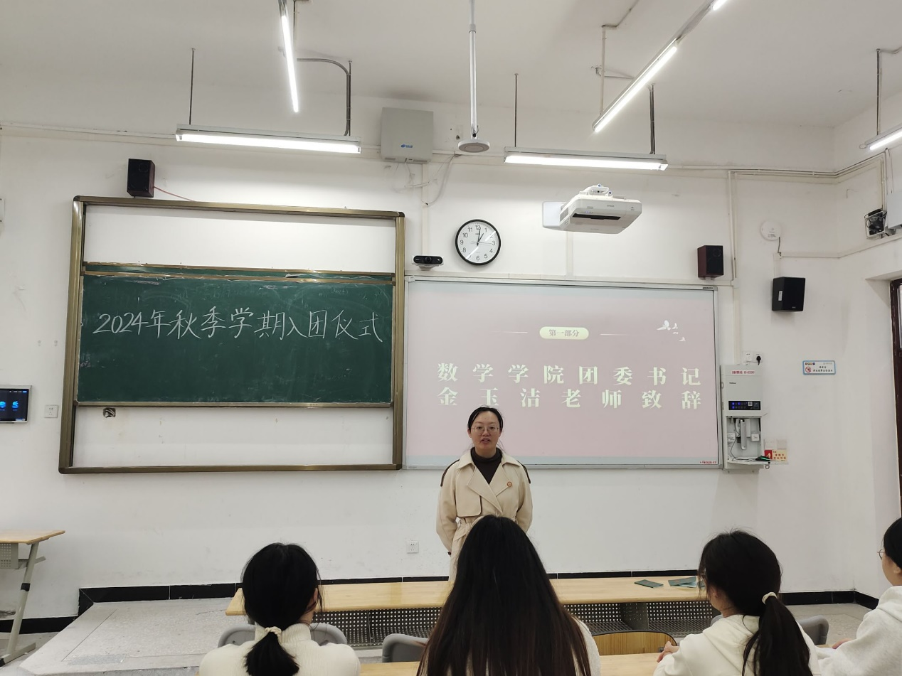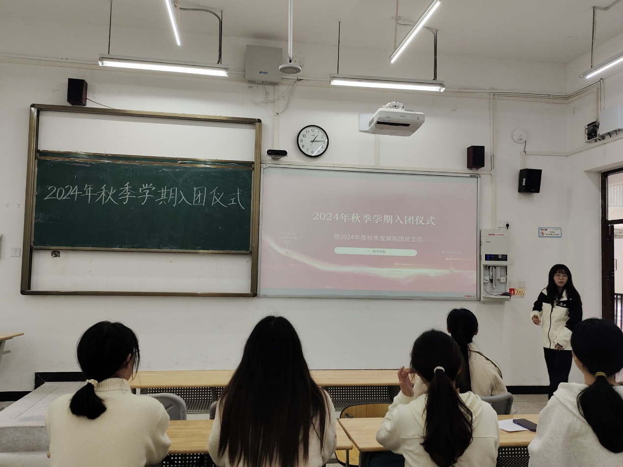 【本网讯】为迎接新一批中国共青团团员的加入,2024年11月14日,数学学院于树人楼D101举行2024年秋期学期入团仪式,参与此次仪式的是数学学院团委书记金玉洁老师和全体新团员。此次仪式由王铃旗主持。