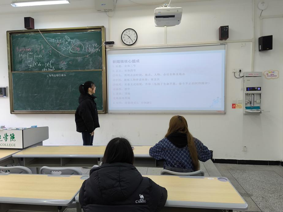 任婉瑜围绕新闻稿的核心要素进行了详细介绍,重点讲解了新闻稿的结构安排、用词规范以及不同类型的新闻报道方法。此外,她还特别强调,各班的宣传委员应积极策划并组织班级文化活动,同时做好相关的宣传报道工作。