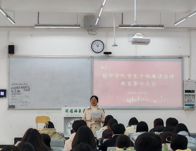 【本网讯】为加强学生干部的廉洁自律意识,提升学生干部的整体素质,2024年12月6日12:40,数学学院于树人楼C102召开学生干部廉洁自律教育警示大会,参与此次会议的是我院团学委全体成员。会议由我院团委书记金玉洁老师主持。