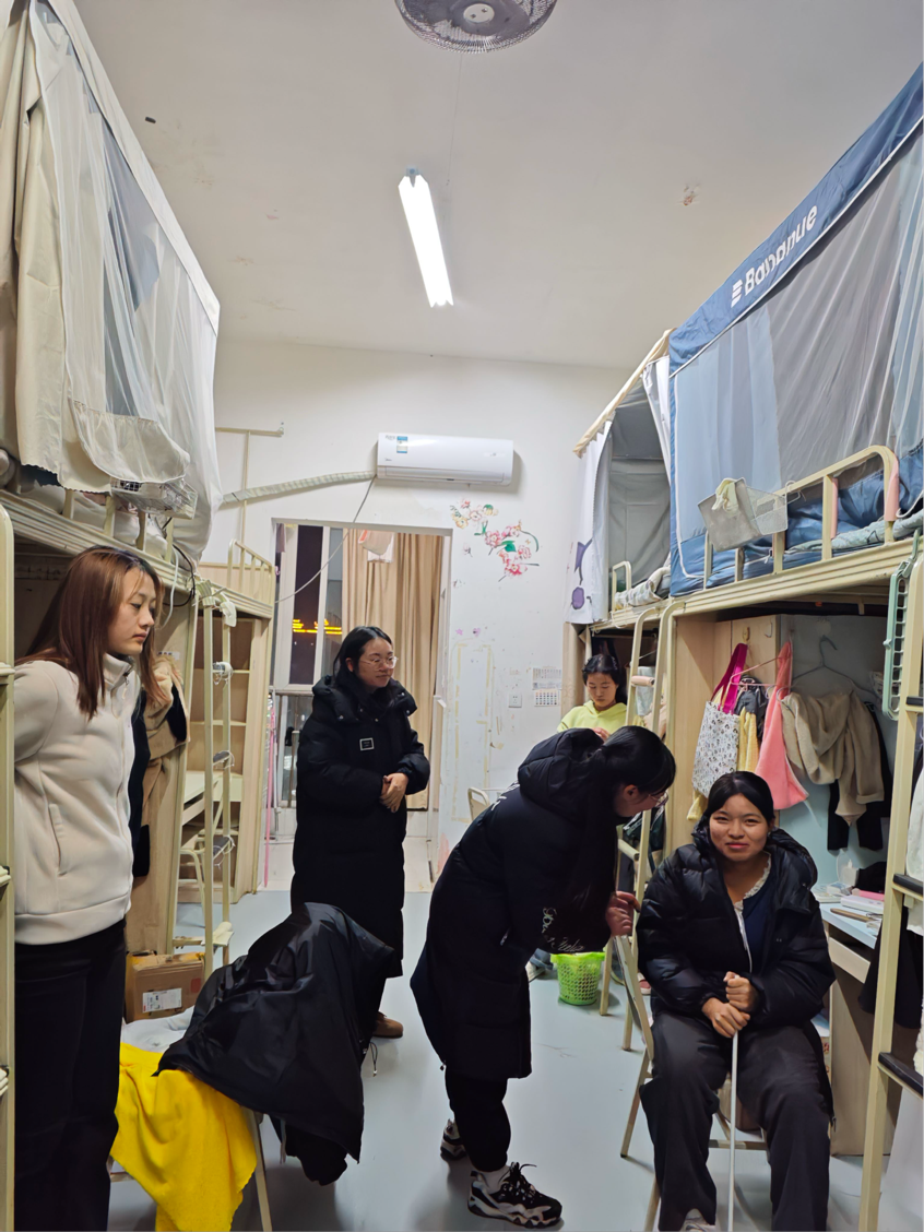 【本网讯】为加强宿舍规范化管理,引导学生保持良好的卫生习惯和健康的学习生活节奏。2024年12月9日21:15,数学学院党委书记蒋自国教授、学生工作办公室副主任金玉洁老师、辅导员曾红老师带领我院团学委主席团成员和公寓部全体工作人员前往学生公寓开展走访寝室活动。