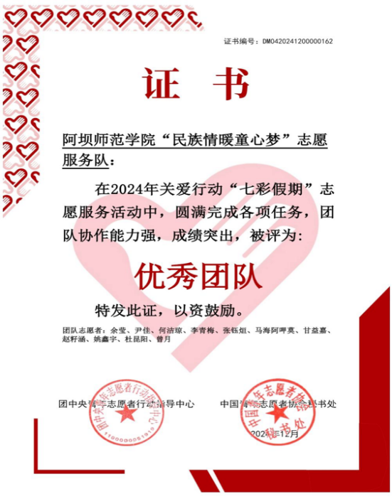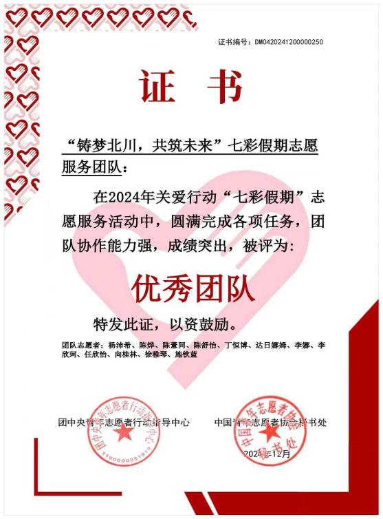 【本网讯】2024年12月,团中央青年志愿者行动指导中心、中国青年志愿者协会秘书处联合公布了2024年“七彩假期”志愿服务优秀团队评选结果,我院“铸梦北川,共筑未来”七彩假期志愿服务团队、“民族情暖同心梦”七彩假期志愿服务团队成功入选,并在此次全国评选中获得“优秀团队”荣誉称号。