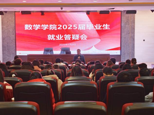 【本网讯】为帮助毕业生明晰就业方向、解决求职困惑。2025年1月2日14:30,数学学院于学术报告厅召开2025届毕业生就业答疑会。参与此次会议的有数学学院党委书记蒋自国教授、团委书记金玉洁老师、团委副书记王全智老师、辅导员曾红老师以及2025届全体毕业生,本次会议由蒋自国书记主讲。