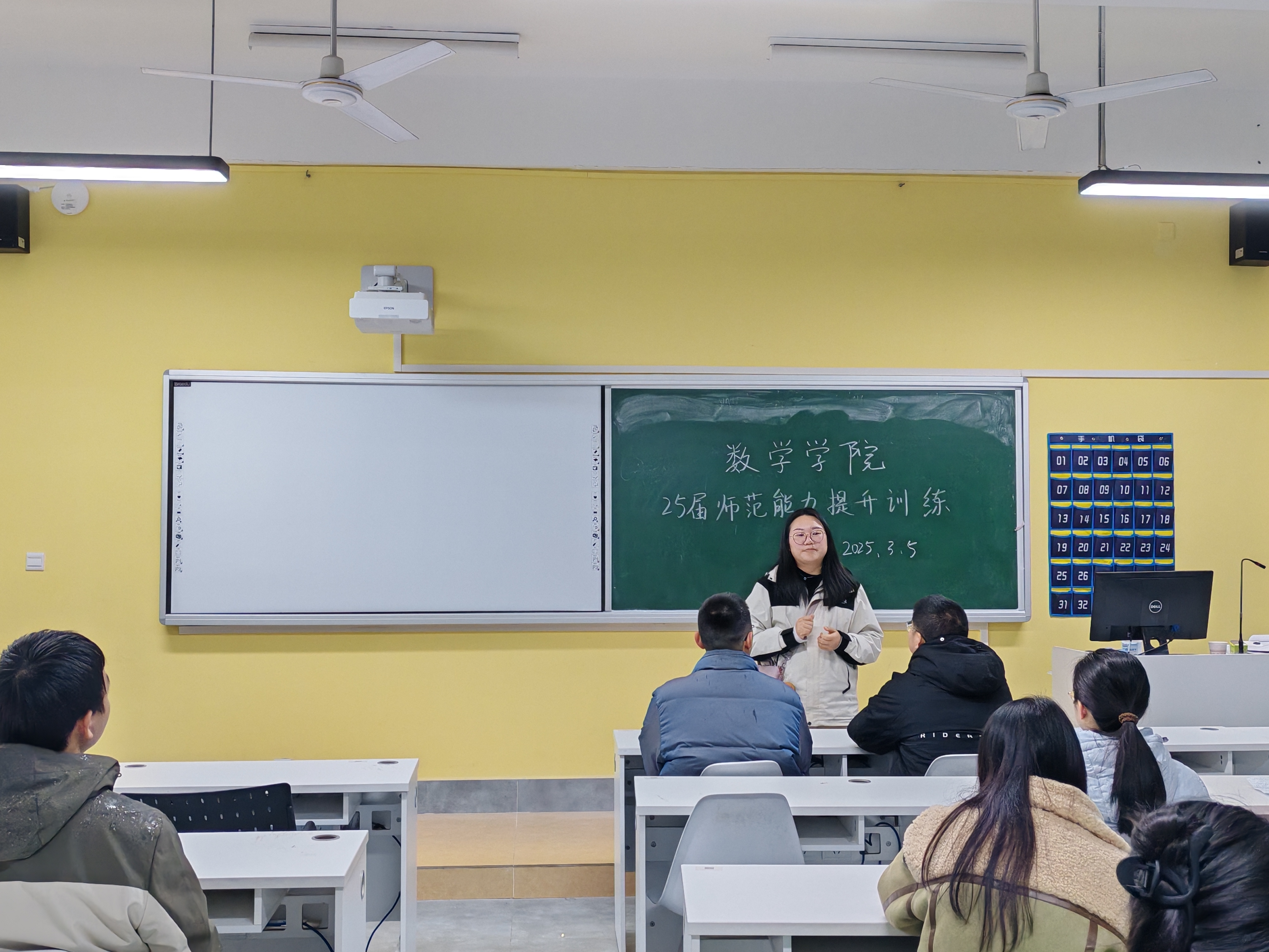 【本网讯】为提升毕业生的师范能力,2025年3月5日19:00,数学学院于实验楼B107开展2025届毕业生师范能力提升专项训练活动。参加此次活动的有数学学院团委副书记王全智老师、辅导员曾红老师,物理与电子电气工程学院教师王清平老师以及部分2025届毕业生代表。