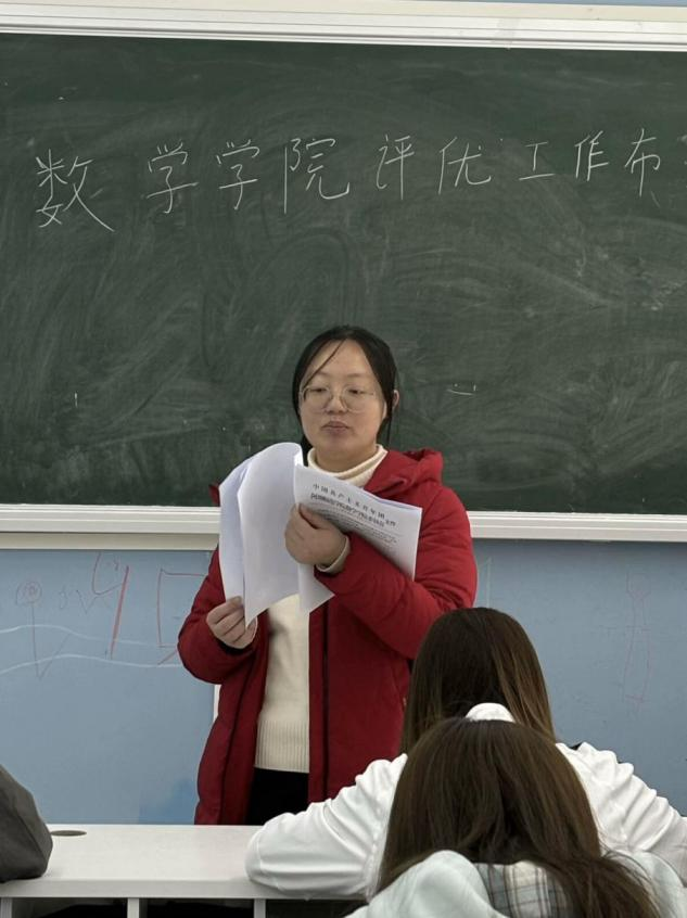 【本网讯】为进一步规范大学评优评先工作流程,构建公平、公正、公开的评价体系。2025年3月24日12:40,数学学院于实验楼B107召开评优工作布置会。参与此次会议的有我院团委书记金玉洁,团委副书记王全智,我院组织部全体成员及各班团支书。