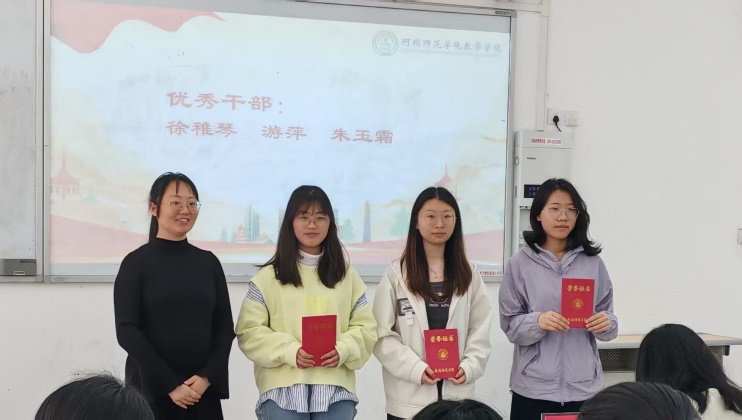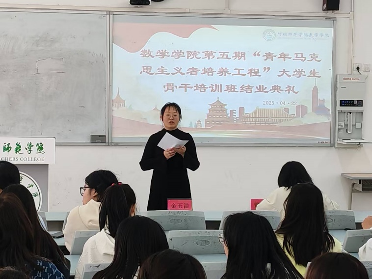 【本网讯】2025年4月22日12:40,数学学院于树人楼C201举办第五期“青年马克思主义者培养工程”大学生骨干培训班结业典礼。出席本次典礼的有我院团委书记金玉洁老师,第二党支部副书记曾红老师。此次典礼由杨彧瑶,杨金承主持。