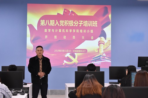 【本网讯】2019年5月31日18:30,数学与计算机科学学院在实验楼B107召开了第八期入党积极分子培训班开班动员会,参加本次会议的人员有我院党总支书记庄伯财老师,辅导员金玉洁老师,第八期入党积极分子党校培训班全体成员。