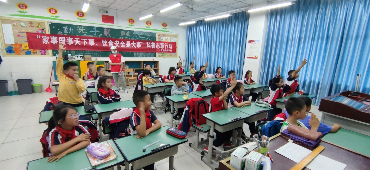 到达漩口小学后,在副校长的带领下,各小组到达了所要开展活动的班级进行科普宣讲。饮食安全组到的二年一班,组员们设置了一些与饮食安全相关的问题让同学们回答,二年一班的同学们都积极的回答。卢浩南主要负责给回答问题的同学们颁发奖品,朱艳负责拍摄方面的工作,全组同心协力,顺利完成了这次饮食安全实践活动。