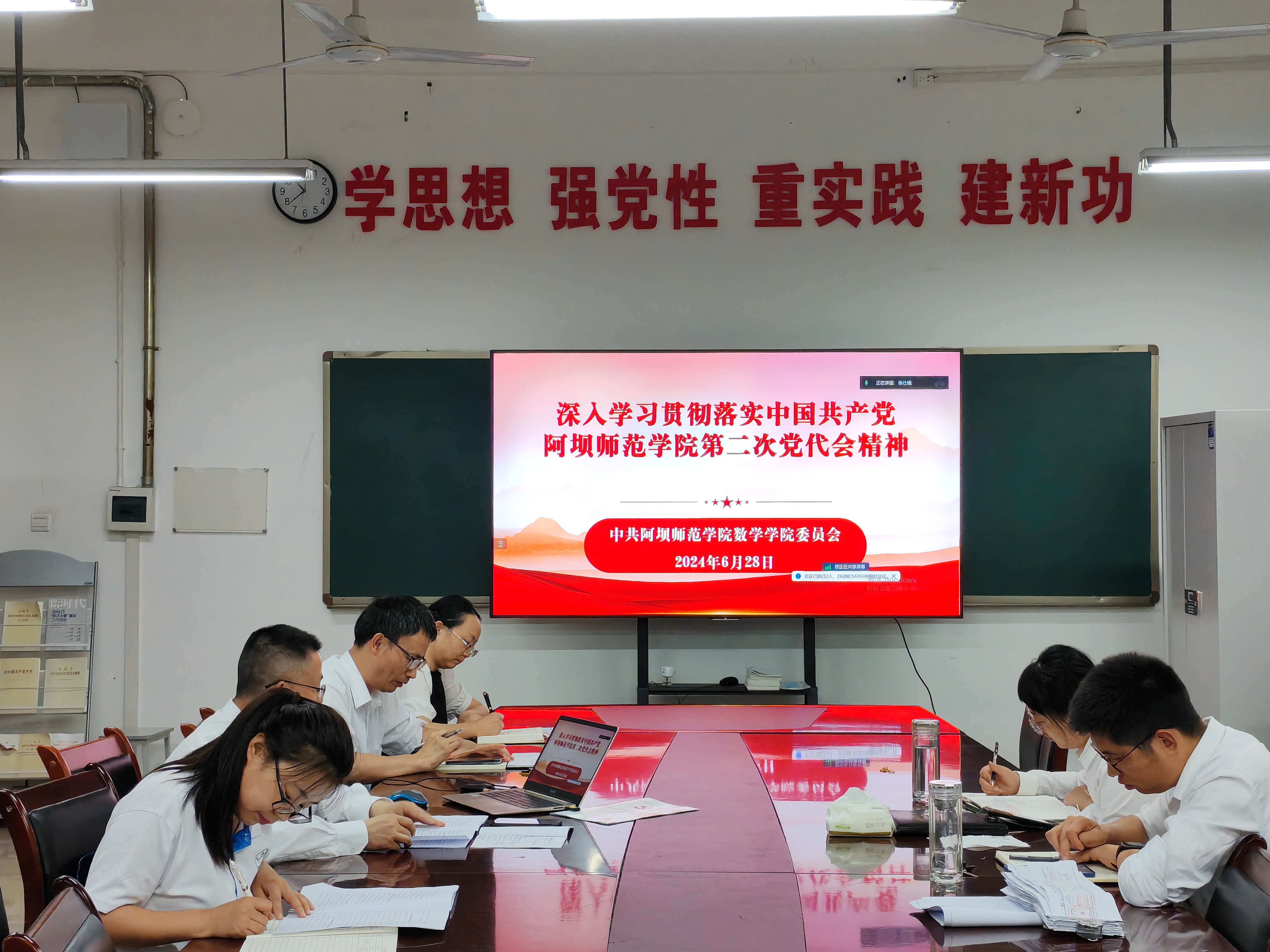 【本网讯】2024年6月28日14:30,数学学院党委在实验室B113会议室开展党委中心组(扩大)会议。会议由学院党委书记蒋自国同志主持,全体党委委员、科级干部、教研室主任参加了此次会议。蒋自国书记传达了中国共产党阿坝师范学院第二次代表大会会议精神,参会人员集体学习了《守正创新 强能提质 奋力开创学校高质量发展新局面》报告。报告内容:系统回顾总结学校第一次党代会以来的非凡性成就和规律性认识;明确今后五年的工作指导思想、奋斗目标和主要任务举措。