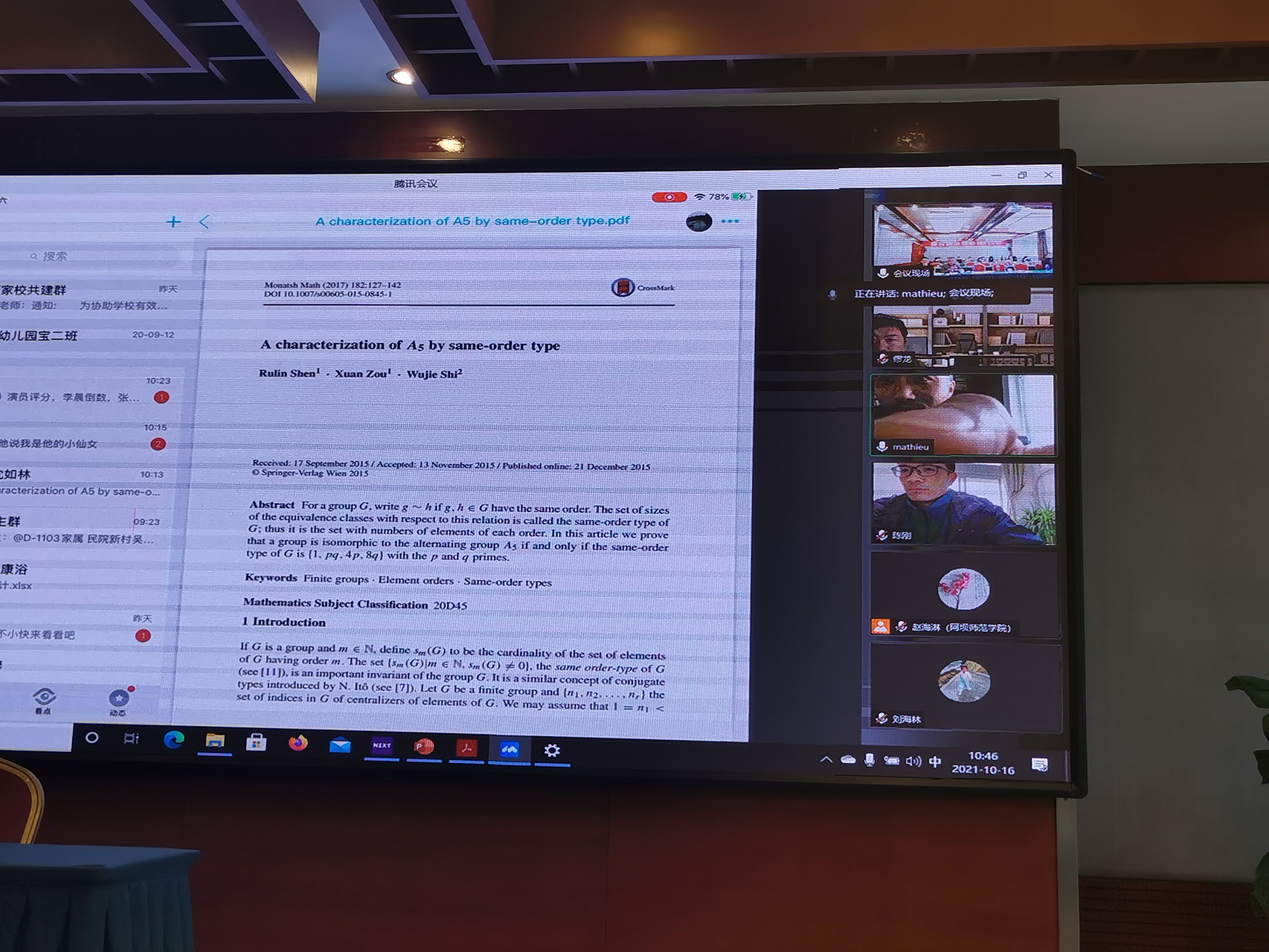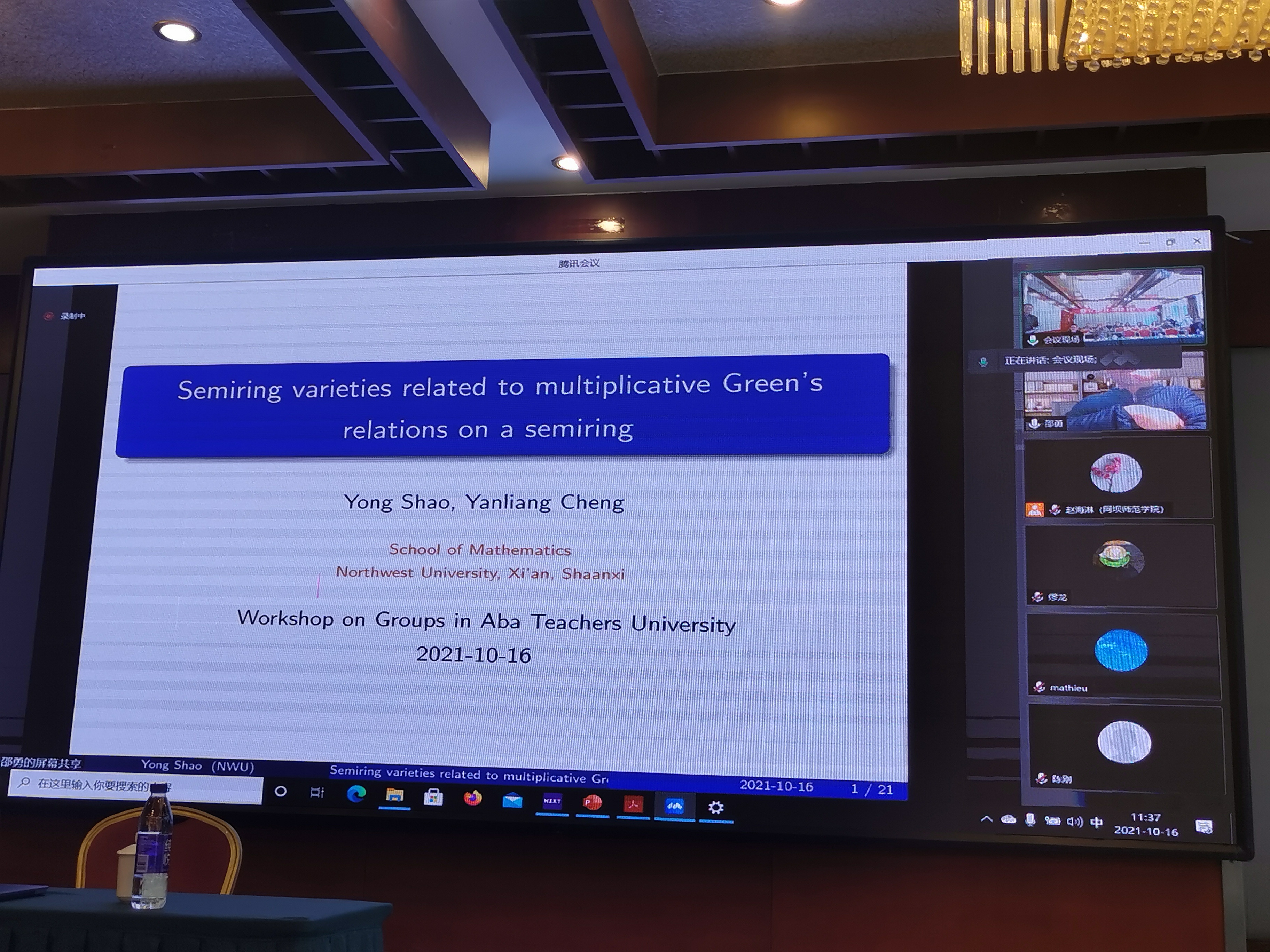 由于疫情防控等有关原因,四位专家在线上进行了学术报告和讨论。陈刚教授作了《Finite Groups whose Character Rings Have a Subring of Maximal Rank.》的学术报告,缪龙教授作了《指数非素数方幂的极大子群对群结构的影响》的学术报告,沈如林教授作了《A characterization of A5 by same-order type》的学术报告,邵勇教授作了《Semiring varieties related to multiplicative Green’s relations on a semiring》的学术报告。专家们分别就自己在群论方面的研究作了报告并进行了热烈讨论。